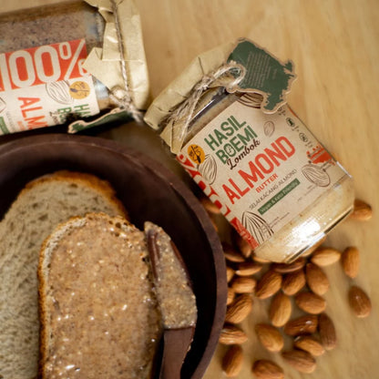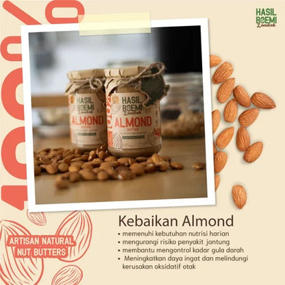 Selai Almond diproses dengan cara dipanggang (Roasted) untuk mendapatkan tekstur creamy dan meningkatkan kandungan Antioksidan.